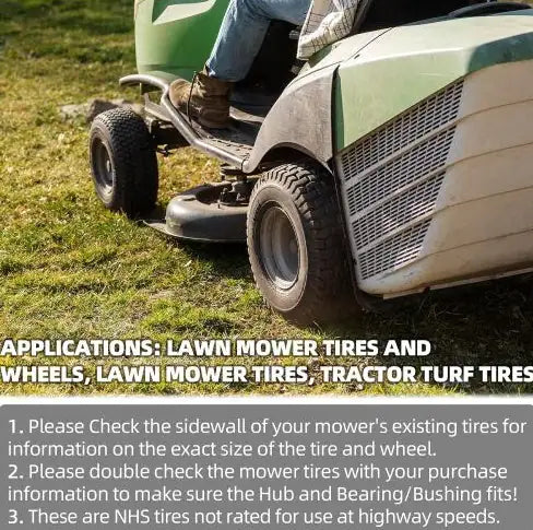 Compatible with most ride-on lawn mowers: Compatible with selected yard tractors, lawn mower tires, agricultural equipment, and other wheeled lawn and garden equipment. These are NHS tyres and are not suitable for highway speeds.